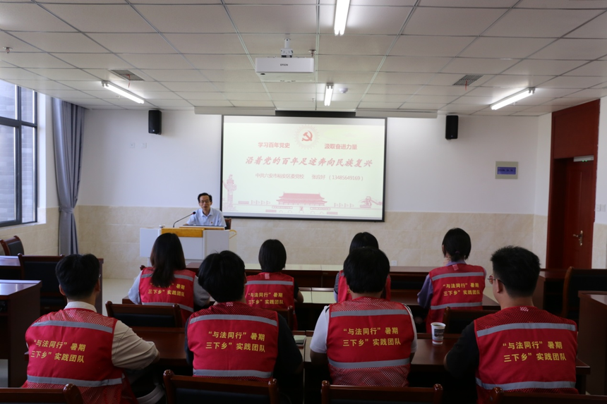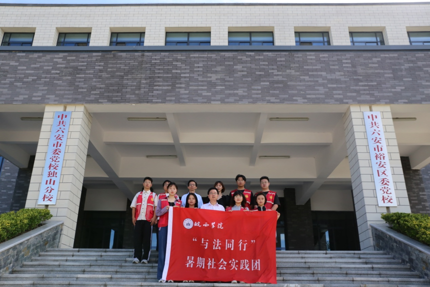 6月21日上午,皖西学院法学院“与法同行”志愿服务队“走红色革命路,共筑和谐法治梦 ”社会实践活动在我校举行。先由裕安区委党校党支部书记、常务副校长罗行武同志向同学们介绍独山红色历史和党校概况,并勉励同学们学好六安红色历史,苦练本领,报效祖国;接下来,区委党校党务工作者张应好同志为大家上了一节题为《沿着党的百年足迹奔向民族复兴》的党课。课后同学们参观了校园并合影留念。
